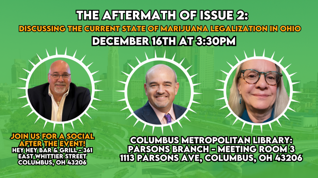 On November 7th 2023, Ohio citizens voted to pass Issue 2, a ballot initiative that would legalize cannabis statewide. However, many Republican lawmakers have already begun to attack Issue 2 and are already trying to pass new restrictions before Issue 2 goes into effect. With everything moving so fast, people are left to wonder: What happens next? What is or is not legal? Where will the tax revenue go? What does this mean for the broader conversation around criminal justice reform? Join us on December 16th to hear from those working on the issue. After the event, join us at Hey Hey Bar & Grill for our monthly social! First round of drinks is on us!