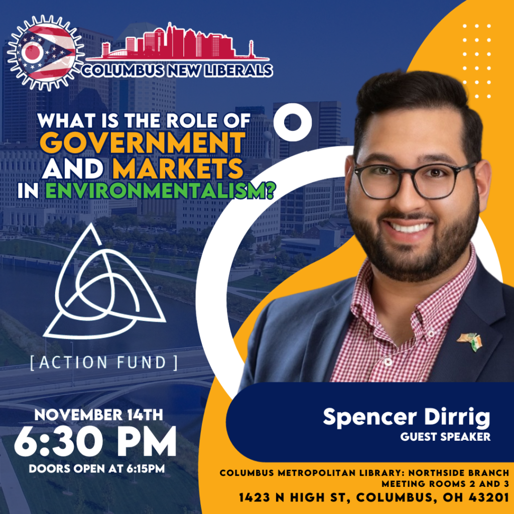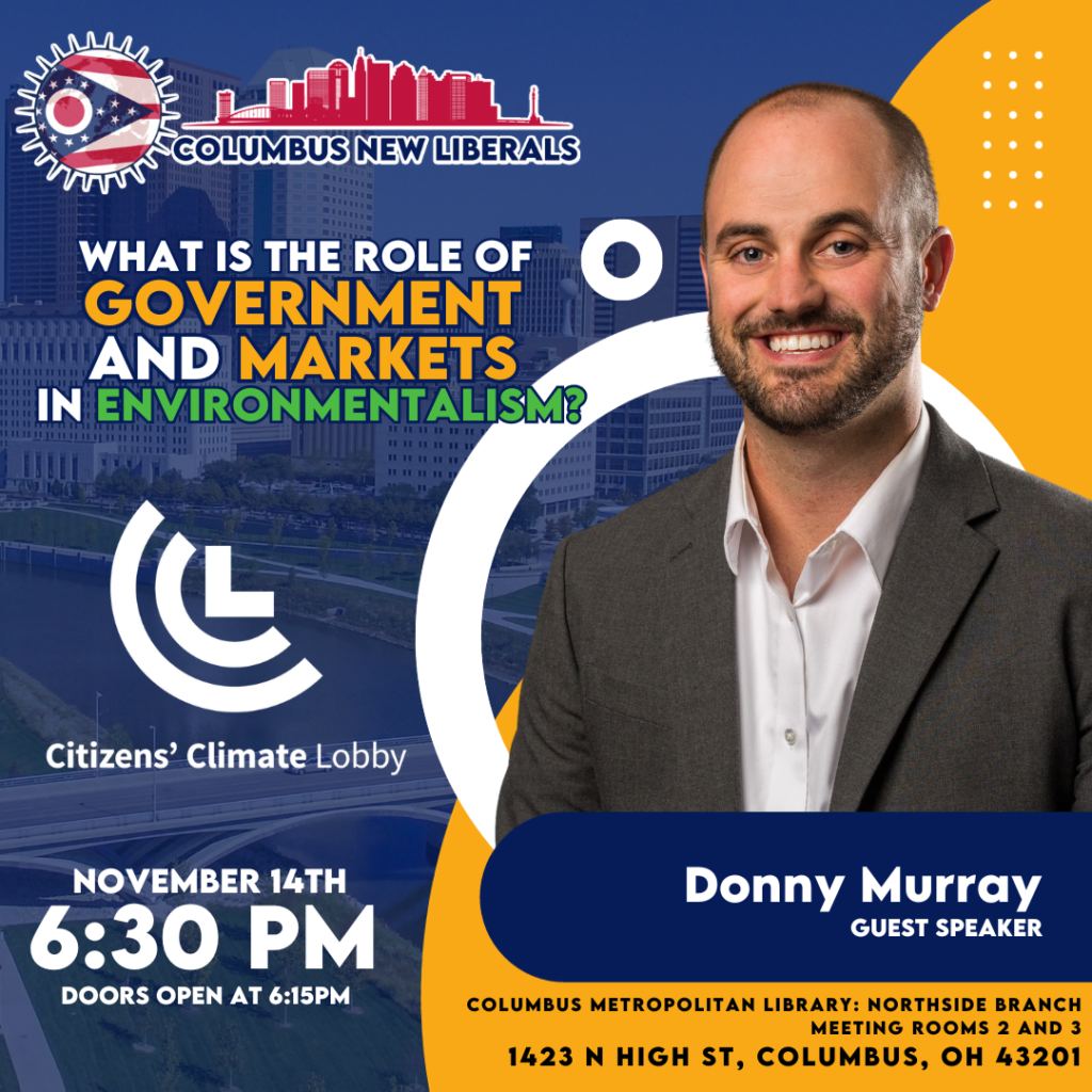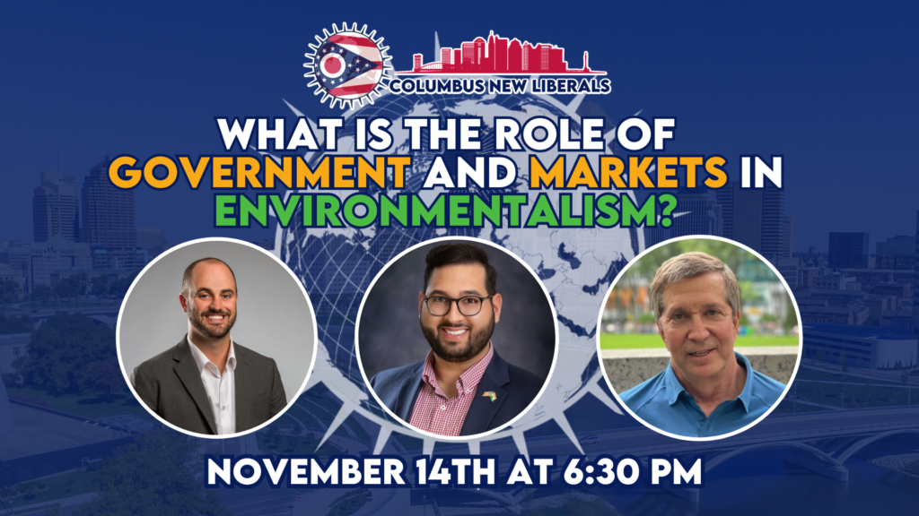 Join us on the evening of November 14th for an engaging speaker panel hosted by the Columbus New Liberals. Our panelists will engage in a thought-provoking discussion on the intricate relationship between government and markets in shaping environmental policy.