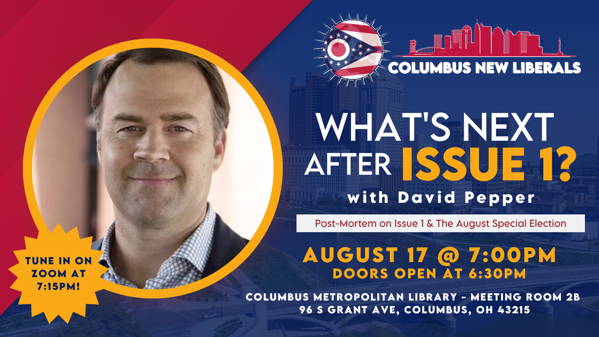Join the Columbus New Liberals for a post-mortem discussion on Ohio's infamous Issue 1. Joining us via Zoom is special guest David Pepper! David is a lawyer, writer, political activist, former elected official, professor, and served as the Chairman of the Ohio Democratic Party between 2015 and 2021.